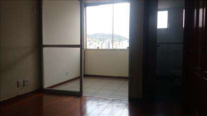 Sala ampla e bem iluminada, com lavabo e varanda com vista agradável.