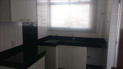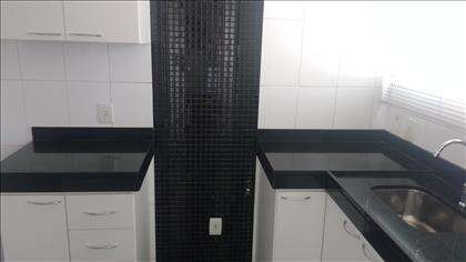 Cozinha espaçosa, com armários de qualidade sobre e sob bancada em granito, além de piso em porcelanato.