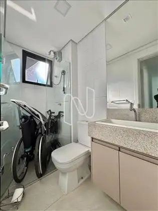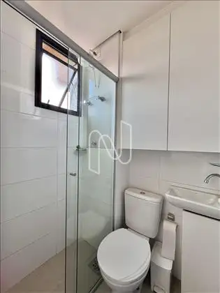 - Banheiro social com espelho, armários e box de vidro;